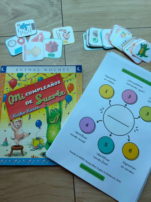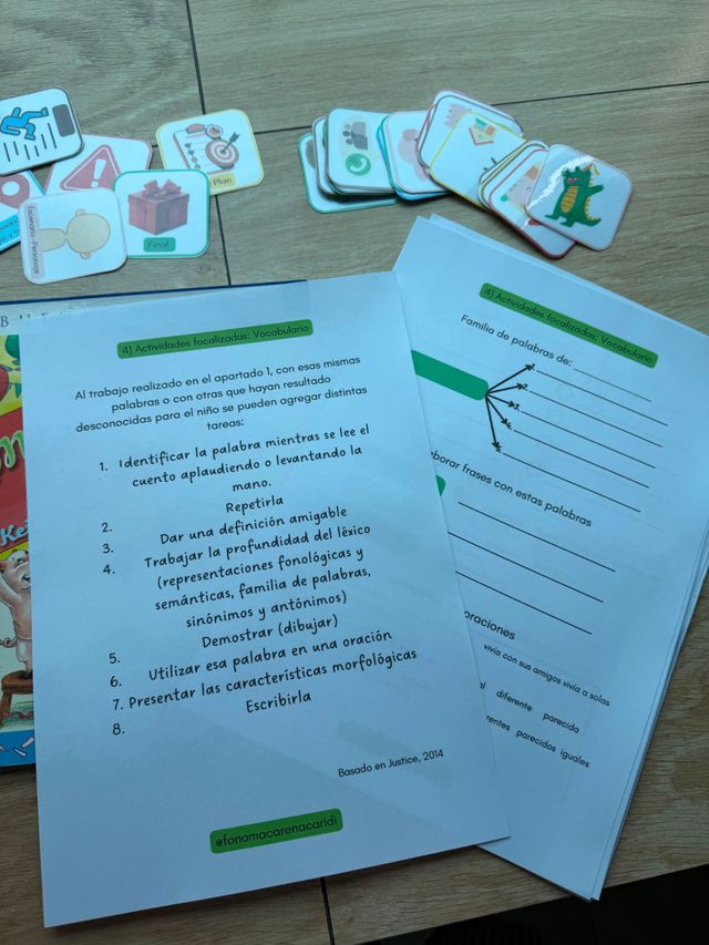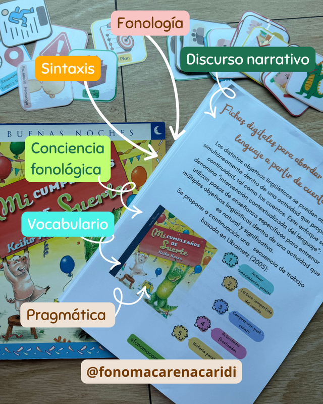 - Actividades focalizadas en fonología y fonética, conciencia fonológica, discurso narrativo, vocabulario, redes semánticas, pragmática y sintaxis.