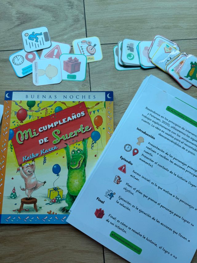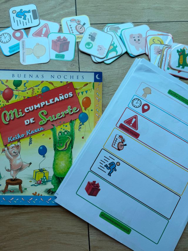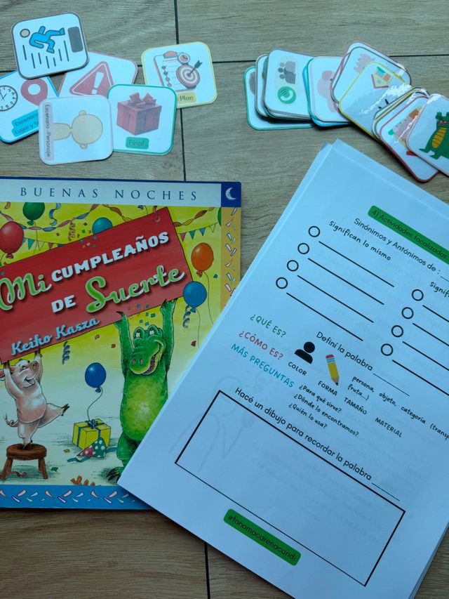 Incluye 23 fichas digitales para abordar los cuatro aspectos del lenguaje a partir del cuento Mi cumpleaños de suerte de la autora Keiko Kasza